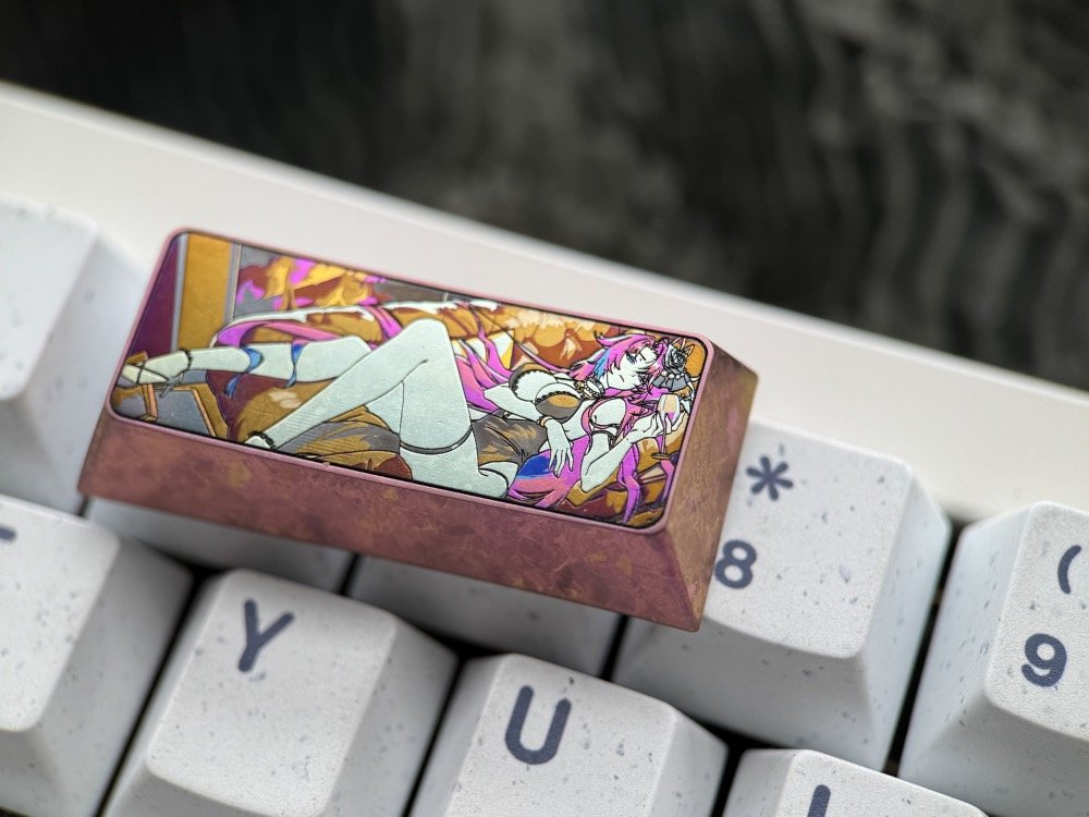 Floro custom hand-carved keycaps. Skilled masters meticulously carve each line under high magnification, and finally anodize the inside of the carved lines. The result is a precision titanium alloy hand-carved colored keycap.